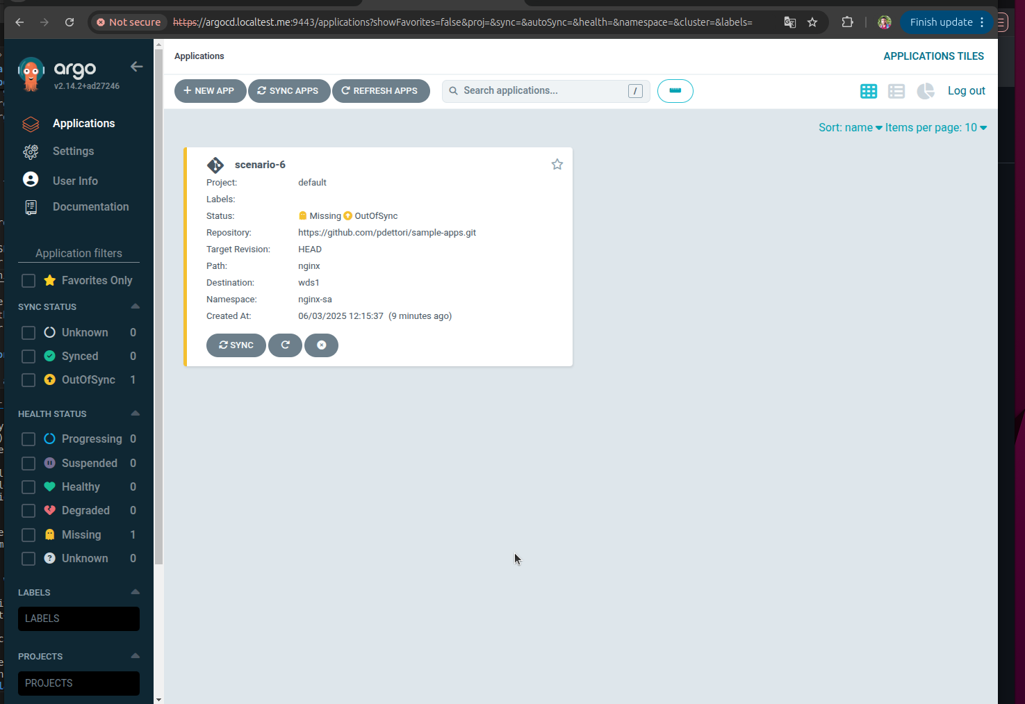 argocd:applications:# list of Argo CD applications to be create-name:scenario-6# required, must be uniqueproject:default# default: defaultrepoURL:https://github.com/pdettori/sample-apps.gittargetRevision:HEAD# default: HEADpath:nginxdestinationWDS:wds1destinationNamespace:nginx-sa# default: defaultsyncPolicy:auto# default: manual